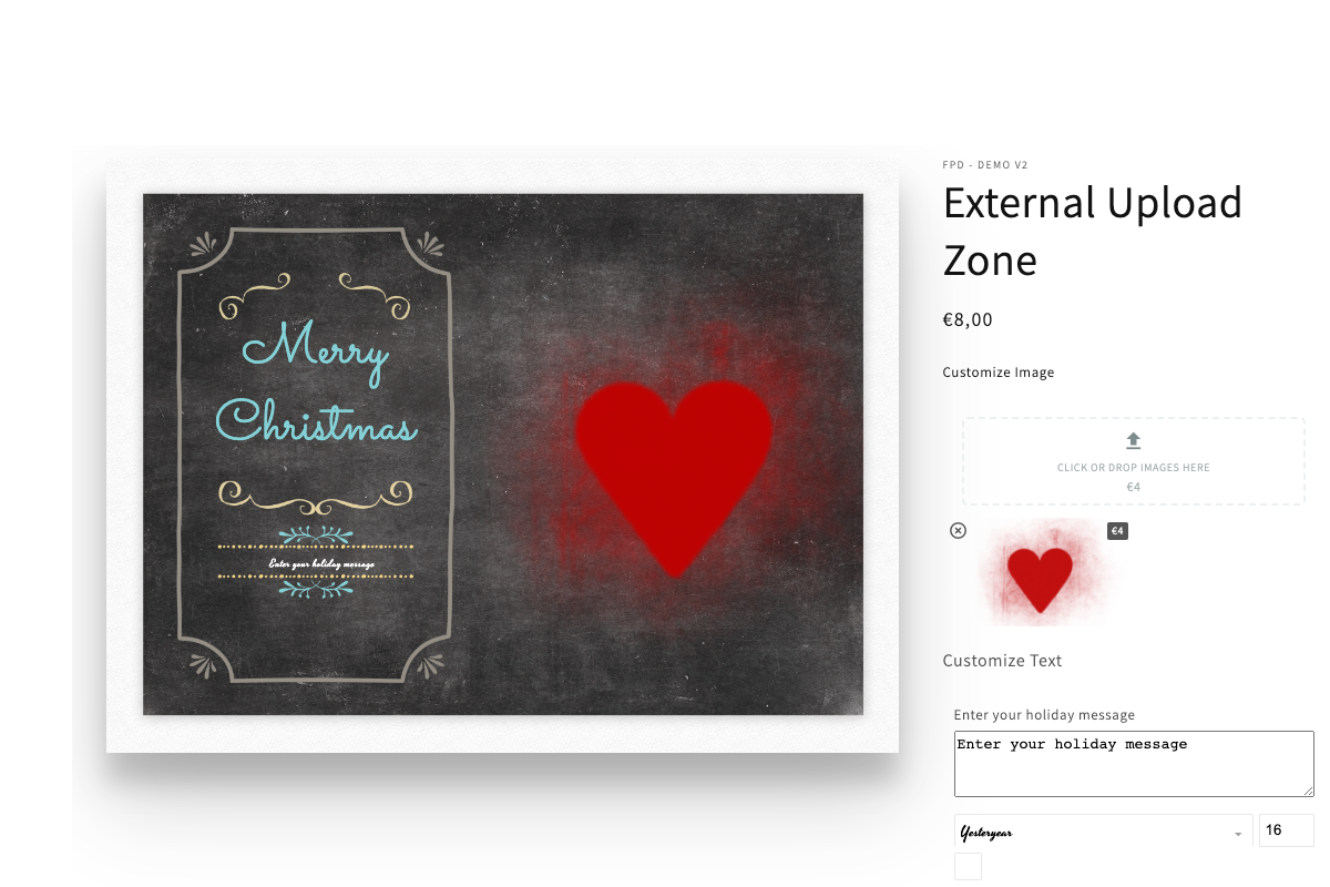 Allow customers to upload images directly from the product page with our External Upload Zone module. No need for interaction with the design tool—just a simple, seamless upload experience. Perfect for quick, efficient image customization!